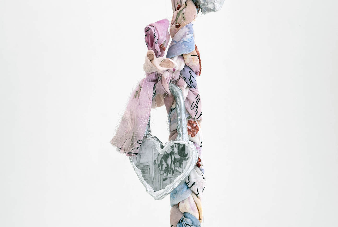 Марина Саковска, Синџир со катанец, 2022/25, плетенки од текстил, акрилици, објекти од катанец: смола, лак за нокти, автомобилски лак, молив на хартија; променливи димензии